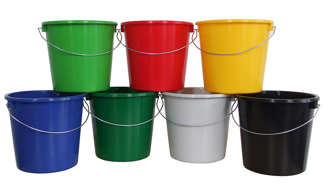 Galeata din plastic, gradata pe interior si cu maner metalic.